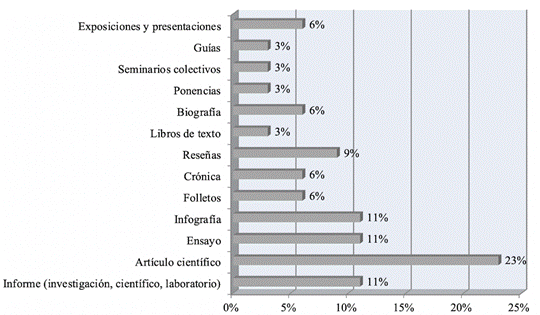 - Artículo científico, informe (investigativo, científico, de laboratorio), infografía, exposición y presentación, reseña, examen, folleto, resumen, textbook, ponencia. |