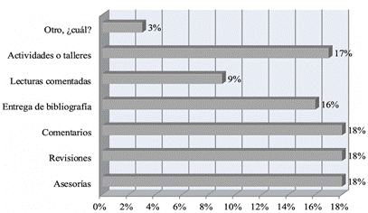 A. Asesorías; B. Revisiones; C. Comentarios; D. Entrega de bibliografía; E. Lecturas comentadas; F. Otro |