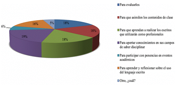 A. Para evaluarlos; B. Para que asimilen los contenidos de clase; C. Para que aprendan a realizar los escritos que utilizarán como profesionales; D. Para aportar conocimientos en sus campos de saber disciplinar; E. Para participar con ponencias o eventos académicos; F. Otra, ¿cuál? |