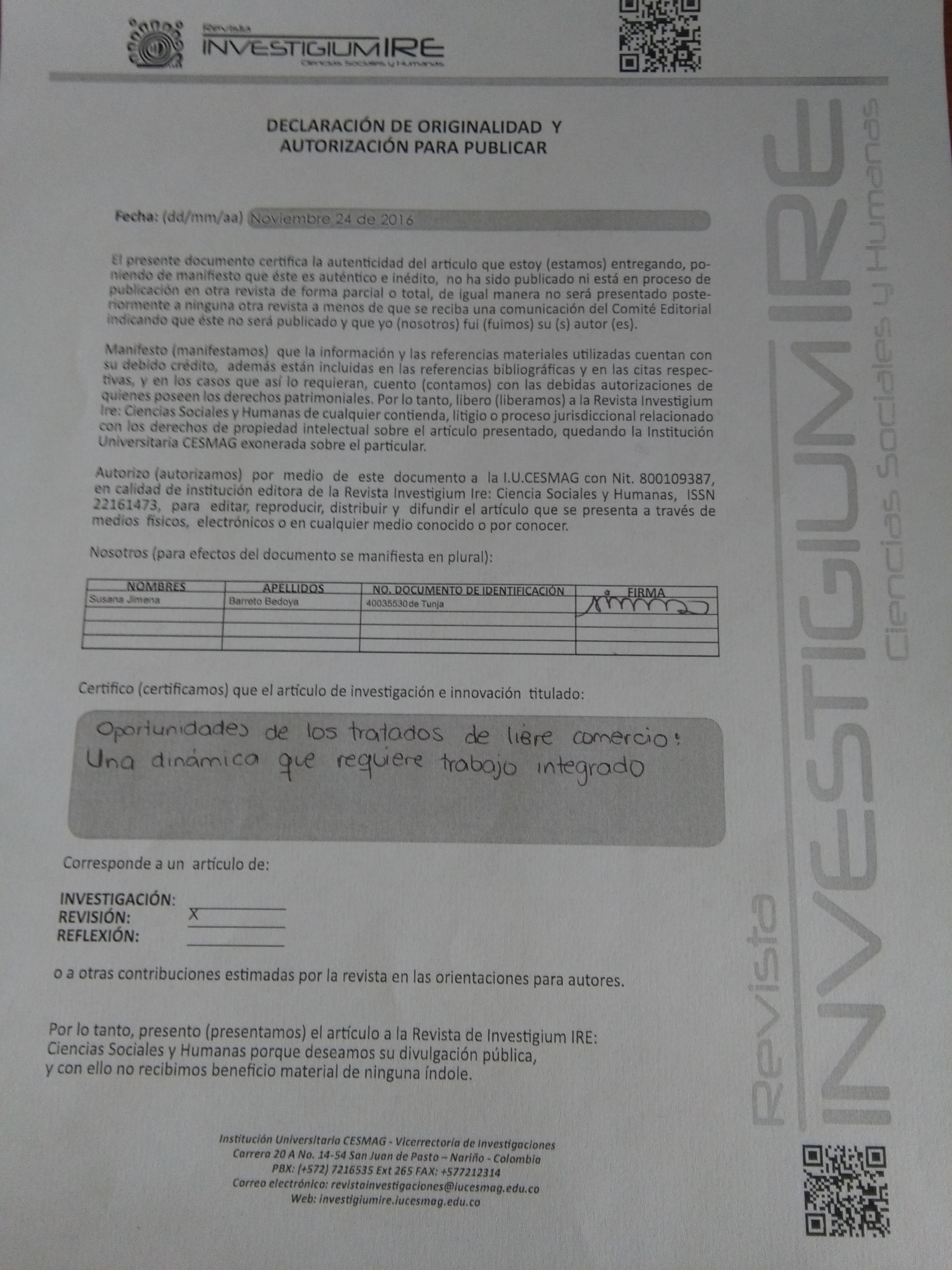 Una vez que el artículo es aceptado por la Revista Investigium IRE: Ciencias sociales y humanas, los/as autores ceden los derechos para publicar y distribuir el texto electrónicamente, así como para archivarlo y hacerlo accesible en línea. Así mismo en los casos que lo requieran, los autores cuentan con las debidas autorizaciones de quienes poseen los derechos patrimoniales. Por lo tanto, libero (liberamos) a la Investigium IRE: Ciencias sociales y humanas de cualquier contienda, litigio o proceso jurisdiccional relacionado con los derechos de propiedad intelectual sobre el artículo presentado, quedando la Universidad CESMAG exonerada sobre el particular.