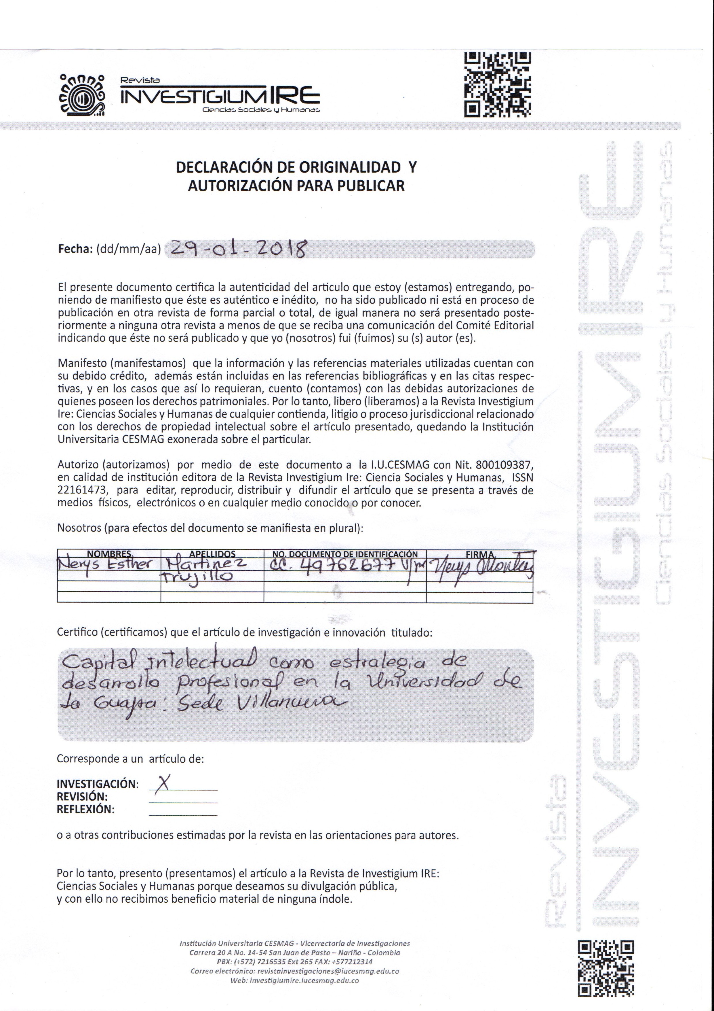 Una vez que el artículo es aceptado por la Revista Investigium IRE: Ciencias sociales y humanas, los/as autores ceden los derechos para publicar y distribuir el texto electrónicamente, así como para archivarlo y hacerlo accesible en línea. Así mismo en los casos que lo requieran, los autores cuentan con las debidas autorizaciones de quienes poseen los derechos patrimoniales. Por lo tanto, libero (liberamos) a la Investigium IRE: Ciencias sociales y humanas de cualquier contienda, litigio o proceso jurisdiccional relacionado con los derechos de propiedad intelectual sobre el artículo presentado, quedando la Universidad CESMAG exonerada sobre el particular.